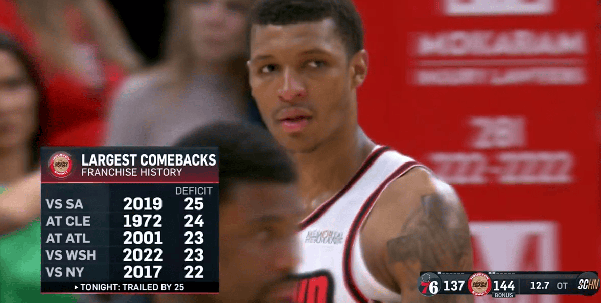 本场比赛落后25分完成逆转,最多最后也追平了火箭队史的落后连胜单场最大逆转分差。